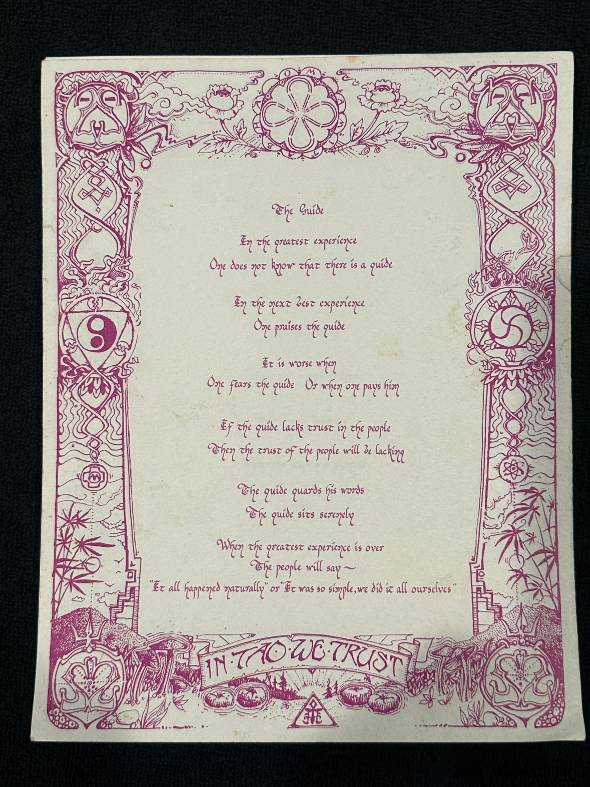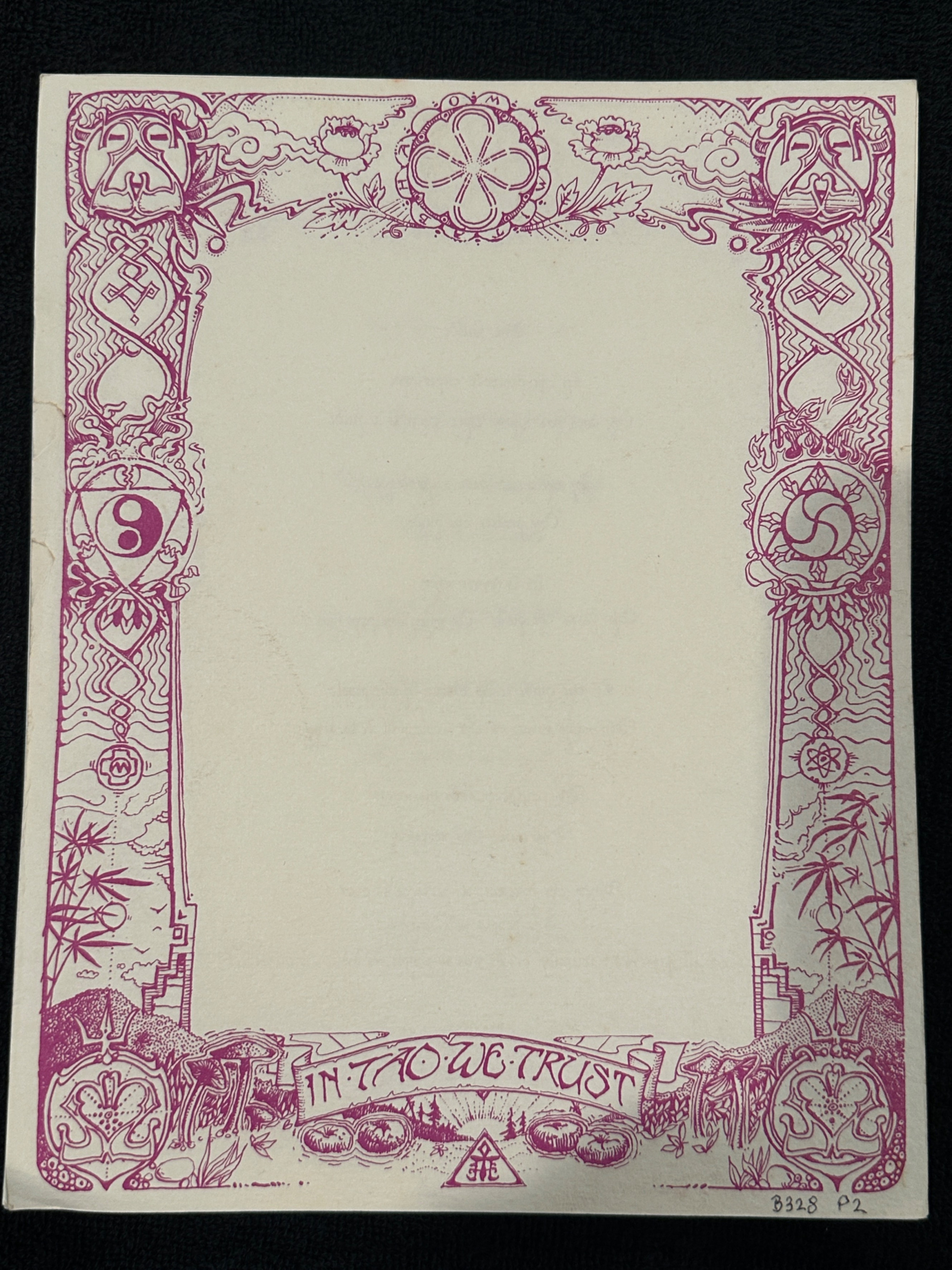 Timothy & Rosemary invisioned this edition as an alternative currency (Note "In Tao We Trust at the center bottom of each page.) The leaf was designed to be traded (not un-like the tokens or NFTs of today). The value of the leaf depended upon the goods or services exchanged for it.